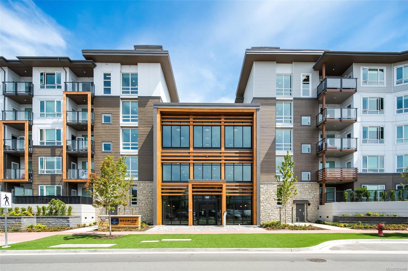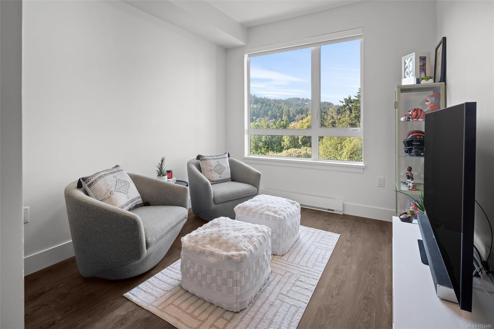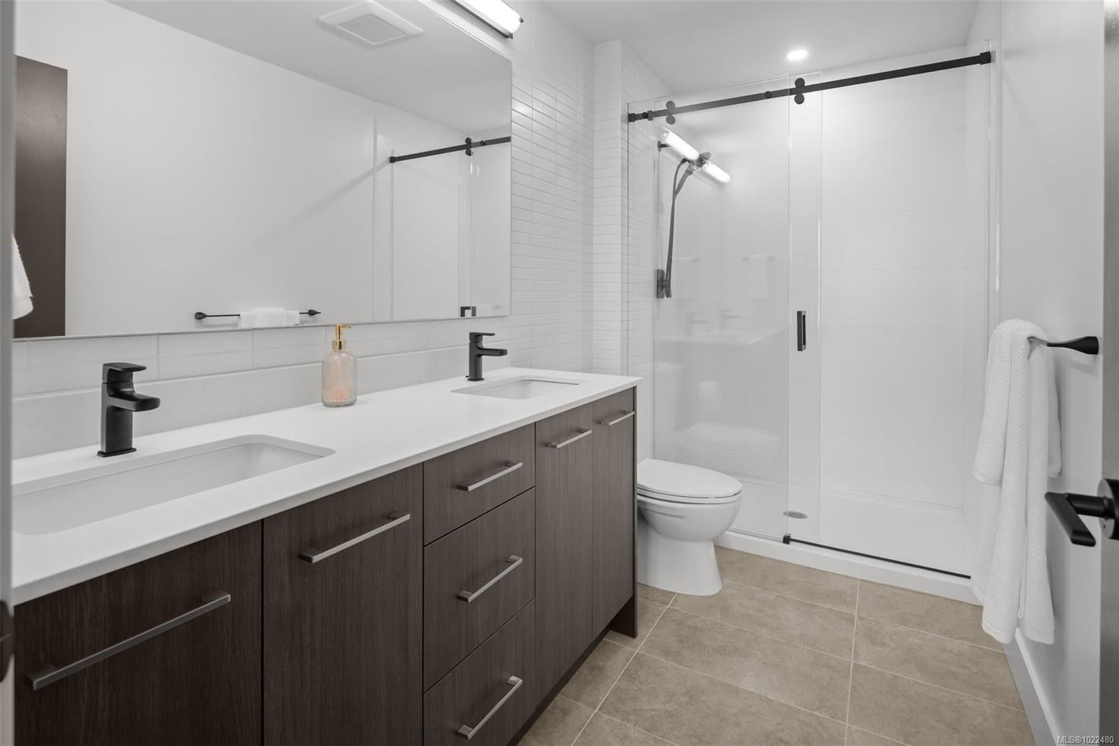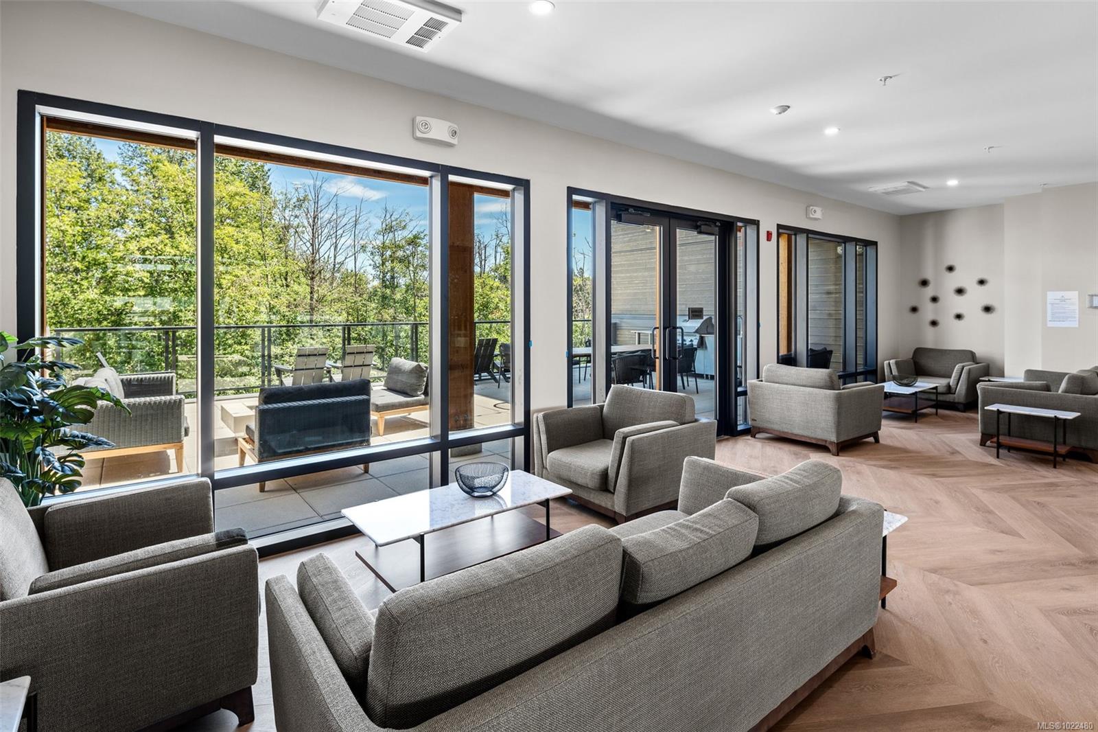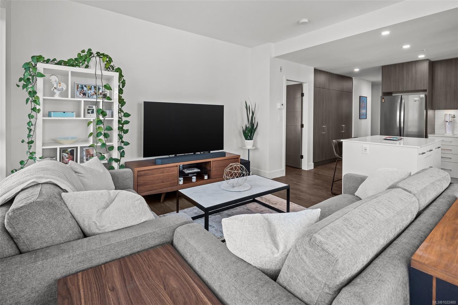 *OH Sat 11:30-1pm.* Large, 2 bed PLUS DEN / 2 bath corner unit with TWO PARKING SPOTS! The ideal layout with one bedroom & bath on either side of a bright, open concept living space. Built in 2024, the unit features premium details: quartz countertops, tiled backsplashes, 9ft ceilings and a full-height sidewall pantry. Modern touches include Energy Star appliances, LED lighting, heat pump/ AC, and open shelving “tech hub” for charging devices. The Reunion has top end common amenities - fitness centre, huge outdoor patio, bike storage, resident lounge, pet wash station and fully fenced dog park. One of the most convenient locations in the Westshore, just steps away from groceries, restaurants and coffee shops in Belmont Commons. Across from Westshore Town Centre Mall for shopping, with Westshore Cineplex and multiple recreation/ entertainment options close by. This checks every box – location, design, home office, extra parking, pet friendly, additional storage, and great amenities.